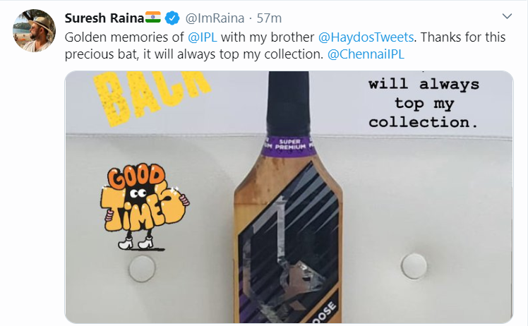 Taking to Twitter Raina shared his favourite memory as he was nominated by Hayden to do so under the hashtag #MyIPLmoment.