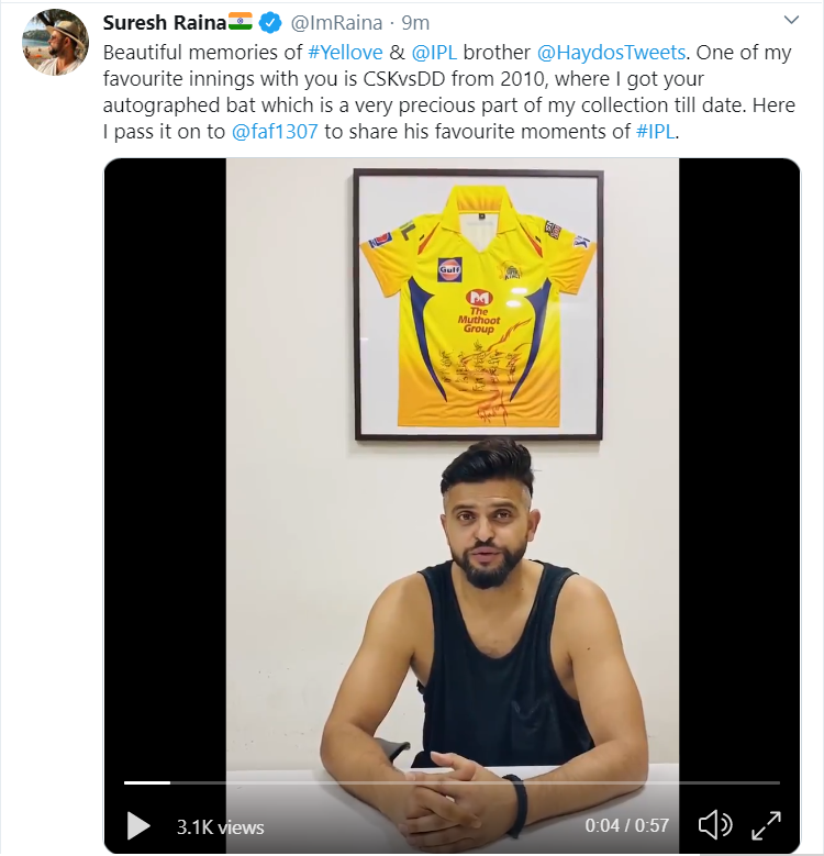 "Now I would love to pass the yellow love to my brother from South Africa Faf du Plessis. Now, you have to tell us your favourite inning and show us the yellow love," Raina said.
