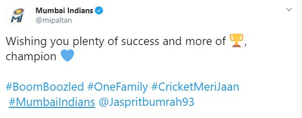 "Wishing you plenty of success and more of titles, champion #BoomBoozled #OneFamily #CricketMeriJaan #MumbaiIndians @Jaspritbumrah93," Indians tweeted.
