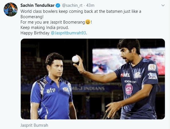 Taking to Twitter Tendulkar wrote, "World-class bowlers keep coming back at the batsmen just like a Boomerang! For me, you are Jasprit Boomerang! Keep making India proud. Happy Birthday, @Jaspritbumrah93."