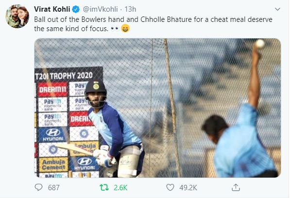 "Ball out of the Bowlers hand and Chholle Bhature for a cheat meal deserve the same kind of focus," Kohli tweeted.