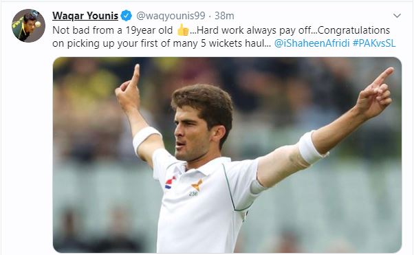 Taking to Twitter Yonis wrote on Saturday, "Not bad from a 19year old...Hard work always pay off...Congratulations on picking up your first of many 5 wickets haul... @iShaheenAfridi #PAKvsSL."
