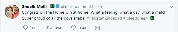 "Congrats on the Home win at home! What a feeling, what a day, what a match. Super proud of all the boys Shaba," cricketer Shoiab Malik tweeted.