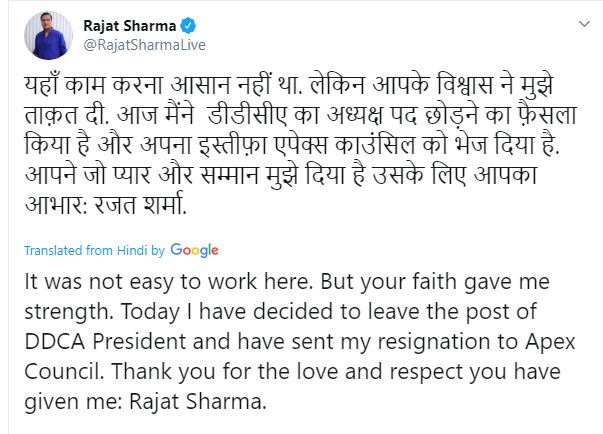 In a tweet, Sharma said: "It was not easy to work here. But your faith gave me strength. Today I have decided to leave the post of DDCA President and have sent my resignation to Apex Council. Thank you for the love and respect you have given me: Rajat Sharma".