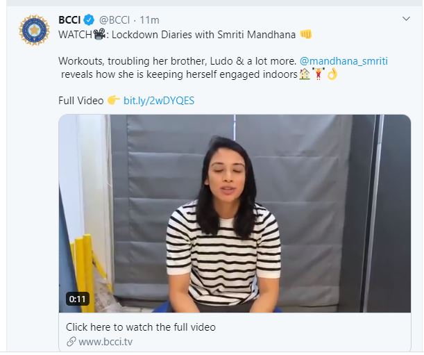 "First is working out, staying fit is really important, I have a workout place at my home, I have tried hard to gather all training equipment, I have had a word with my trainer, he keeps sending us the workouts that we need to follow," Mandhana said in the video posted by BCCI.