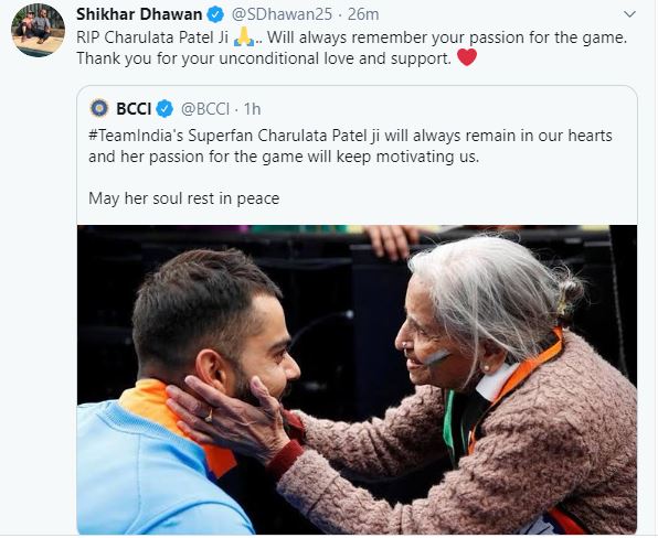 "RIP Charulata Patel Ji.. Will always remember your passion for the game. Thank you for your unconditional love and support," Dhawan tweeted.