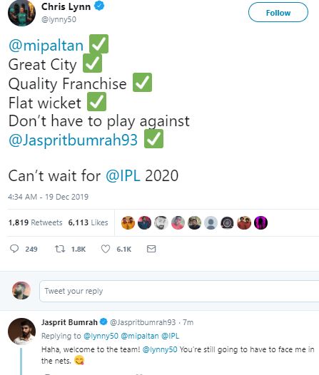 "@mipaltan Great City Quality Franchise Flat wicket Don't have to play against @Jaspritbumrah93 Can't wait for @IPL 2020," Lynn tweeted.