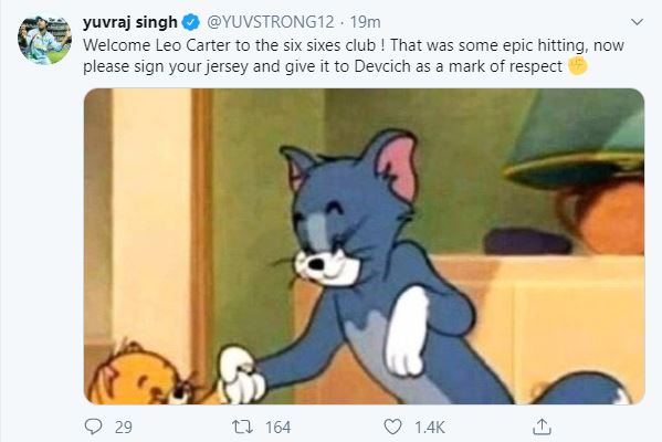 "Welcome Leo Carter to the six sixes club! That was some epic hitting, now please sign your jersey and give it to Devcich as a mark of respect," Yuvraj tweeted.