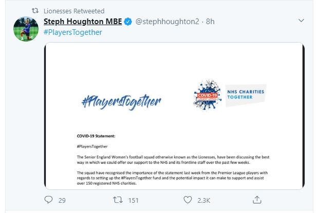 "After discussions with a number of Premier League players, we are delighted to confirm that the whole of the Lionesses squad will make a collective donation to the #PlayersTogether fund, partnering with NHS Charities Together, in unison with the Premier League players in order to support the amazing NHS. Stay Home. Protect the NHS. Save Lives," it added.