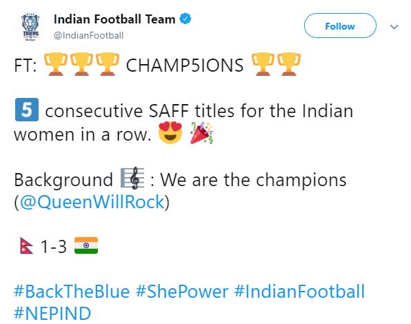 Dalima Chhiber, Grace Dangmei and substitute Anju scored for the team. This win has extended India's run in the tournament history to 23 games.