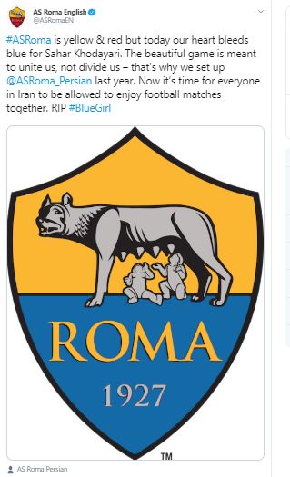#ASRoma is yellow & red but today our heart bleeds blue for Sahar Khodayari. The beautiful game is meant to unite us, not divide us - that's why we set up @ASRoma_Persian last year. Now it's time for everyone in Iran to be allowed to enjoy football matches together. RIP #BlueGirl," AS Roma tweeted.