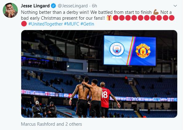 "Nothing better than a derby win!! We battled from start to finish. Not a bad early Christmas present for our fans!!#UnitedTogether #MUFC #GetIn," Lingard tweeted.