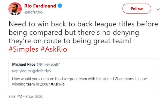 To this tweet, Ferdinand replied: "Need to win back to back league titles before being compared but there's no denying they're on route to being a great team! #Simples #AskRio".