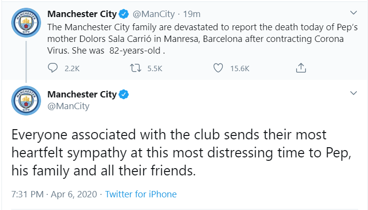 "The Manchester City family are devastated to report the death today of Pep's mother Dolors Sala Carrio in Manresa, Barcelona, after contracting coronavirus. She was 82-year-old," City confirmed in a statement on Twitter.