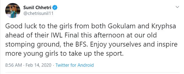 "Good luck to the girls from both Gokulam and Kryphsa ahead of their IWL Final this afternoon at our old stomping ground, the BFS. Enjoy yourselves and inspire more young girls to take up the sport," Chhetri tweeted.