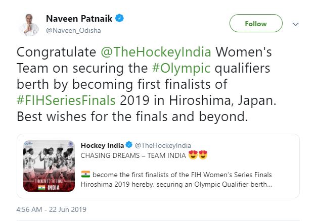 "Congratulate @TheHockeyIndia Women's Team on securing the #Olympic qualifiers berth by becoming first finalists of #FIHSeriesFinals 2019 in Hiroshima, Japan. Best wishes for the finals and beyond," Patnaik said.