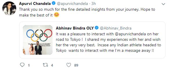 "It was a pleasure to interact with @apurvichandela on her road to Tokyo! I shared my experiences with her and wish her the very very best. In case any Indian athlete headed to Tokyo wants to interact with me I'm a message away!!" Bindra said.