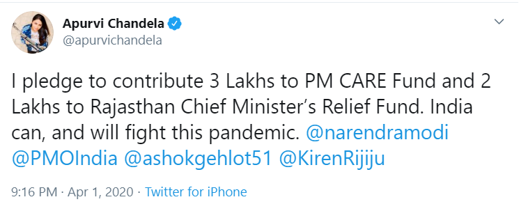 "I pledge to contribute 3 Lakhs to PM CARE Fund and 2 Lakhs to Rajasthan Chief Minister's Relief Fund. India can, and will fight this pandemic. @narendramodi @PMOIndia @ashokgehlot51 @KirenRijiju," Chandela tweeted.