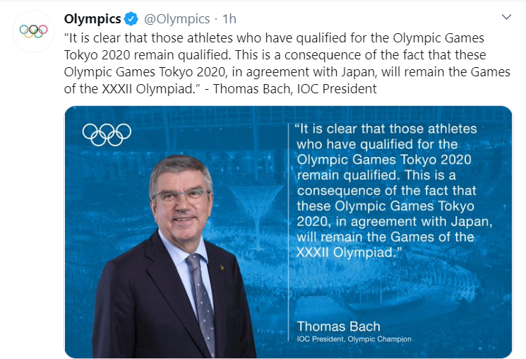 "It is clear that those athletes who have qualified for the Olympic Games Tokyo 2020 remain qualified. This is a consequence of the fact that these Olympic Games Tokyo 2020, in agreement with Japan, will remain the Games of the XXXII Olympiad." - Thomas Bach, IOC President," Olympics official Twitter handle wrote.
