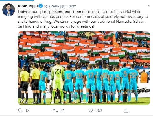 The Sports Minister took to twitter and wrote: "I advise our sportspersons and common citizens also to be careful while mingling with various people. For some time, it's absolutely not necessary to shake hands or hug. We can manage with our traditional Namaste, Salaam, Jai Hind and many local words for greetings!"