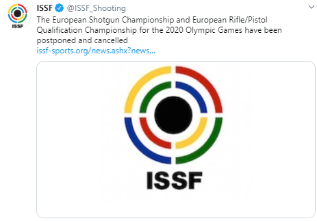 "The European Shotgun Championship and European Rifle/Pistol Qualification Championship for the 2020 Olympic Games have been postponed and cancelled," the ISSF tweeted.