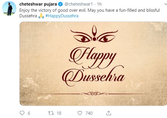 "Enjoy the victory of good over evil. May you have a fun-filled and blissful Dussehr #HappyDussehra," tweeted Indian batsman Cheteshwar Pujara.