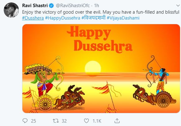 Men's cricket team coach Ravi Shastri wished his followers a Happy Dussehra and wrote, "Enjoy the victory of good over the evil. May you have a fun-filled and blissful."