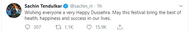 Master blaster Sachin Tendulkar wished his fans on Dussehra and wrote, "Wishing everyone a very Happy Dussehra. May this festival bring the best of health, happiness and success in our lives."