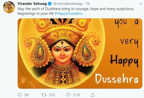 "May the spirit of Dushhera bring in courage, hope and many auspicious beginnings in your life #HappyDussehra," wished former cricketer Virender Sehwag on Twitter.