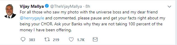 In his defence, Mallya in a tweet said, "For all those who saw my photo with the universe boss and my dear friend @henrygayle and commented, please pause and get your facts right about my being your CHOR. Ask your Banks why they are not taking 100 percent of the money I have been offering."