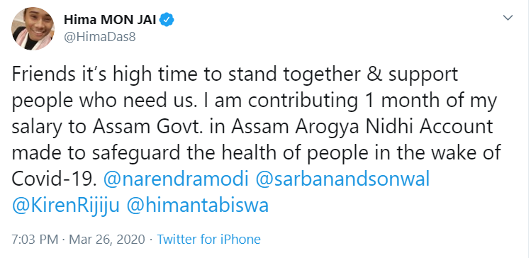"Friends it's high time to stand together & support people who need us. I am contributing 1 month of my salary to Assam Govt. in Assam Arogya Nidhi Account made to safeguard the health of people in the wake of Covid-19. @narendramodi @sarbanandsonwal @KirenRijiju @himantabiswa," Das tweeted.