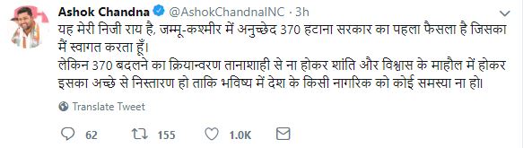 Chandna in a tweet said he welcomes the Centre's decision of scrapping Article 370 of the Constitution. He, however, stressed that it should take place in a manner that no citizen face any problem in future.