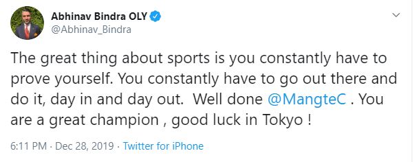 Taking to Twitter, Bindra wrote: "The great thing about sports is you constantly have to prove yourself. You constantly have to go out there and do it, day in and day out. Well done @MangteC. You are a great champion, good luck in Tokyo !"