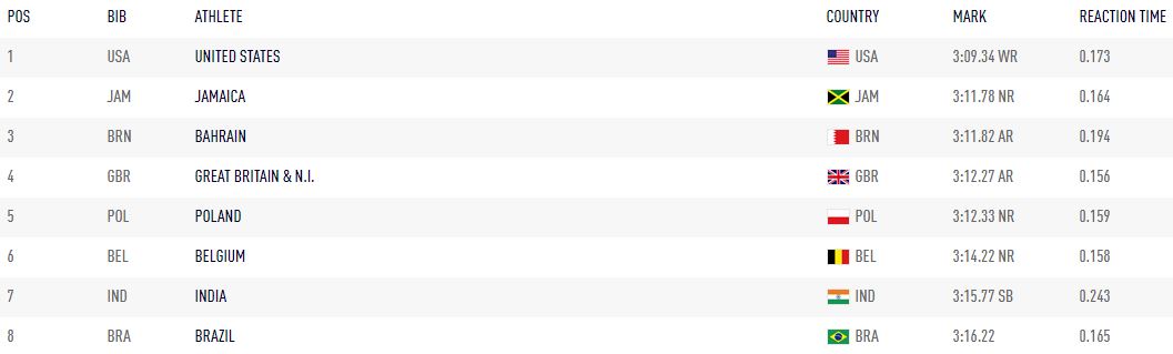 USA won the gold medal with a timing of 3:09:34s. Jamaica finished at the second position whereas Bahrain ended up at the third place.