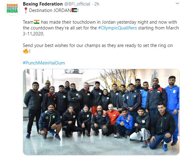 "Destination JORDANFlag of Jordan! TeamFlag of India has made their touchdown in Jordan yesterday night and now with the countdown they're all set for the #OlympicQualifiers starting from March 3-11, 2020. Send your best wishes for our champs as they are ready to set the ring onFire! #PunchMeinHaiDum," Boxing Federation tweeted.