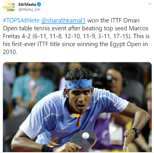 "#TOPSAthlete@sharathkamal1 won the ITTF Oman Open table tennis event after beating top seed Marcos Freitas 4-2 (6-11, 11-8, 12-10, 11-9, 3-11, 17-15). This is his first-ever ITTF title since winning the Egypt Open in 2010," SAI media tweeted.