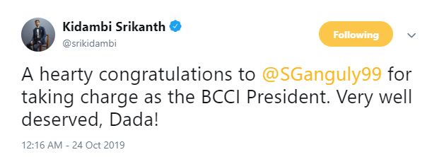 "A hearty congratulations to @SGanguly99 for taking charge as the BCCI President. Very well deserved, Dada!" Srikanth tweeted.