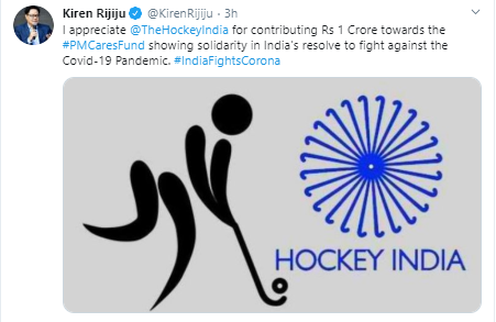 "I appreciate @TheHockeyIndia for contributing Rs 1 Crore towards the #PMCaresFund showing solidarity in India's resolve to fight against the Covid-19 Pandemic. #IndiaFightsCorona," Rijiju tweeted.