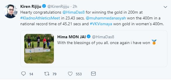 Rijiju took to Twitter and wrote, "Hearty congratulations @HimaDas8 for winning the gold in 200m at #KladnoAthleticsMeet in 23.43 secs, @muhammedanasyah won the 400m in a national record time of 45.21 secs and #VKVismaya won gold in women's 400m."