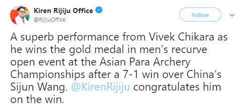 "A superb performance from Vivek Chikara as he wins the gold medal in men's recurve open event at the Asian Para Archery Championships after a 7-1 win over China's Sijun Wang. @KirenRijiju congratulates him on the win," Kiren Rijiju's office tweeted.