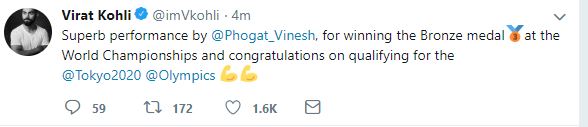"Superb performance by @Phogat_Vinesh, for winning the Bronze medal at the World Championships and congratulations on qualifying for the @Tokyo2020 @Olympics," Kohli tweeted.