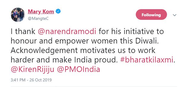 "I thank @narendramodi for his initiative to honour and empower women this Diwali. Acknowledgment motivates us to work harder and make India proud. #bharatkilaxmi. @KirenRijiju @PMOIndia," Kom tweeted.