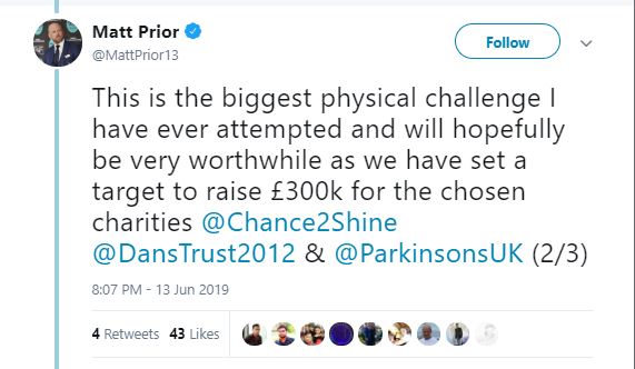 In another tweet, Prior wrote, "This is the biggest physical challenge I have ever attempted and will hopefully be very worthwhile as we have set a target to raise PS300k for the chosen charities @Chance2Shine @DansTrust2012 & @ParkinsonsUK".