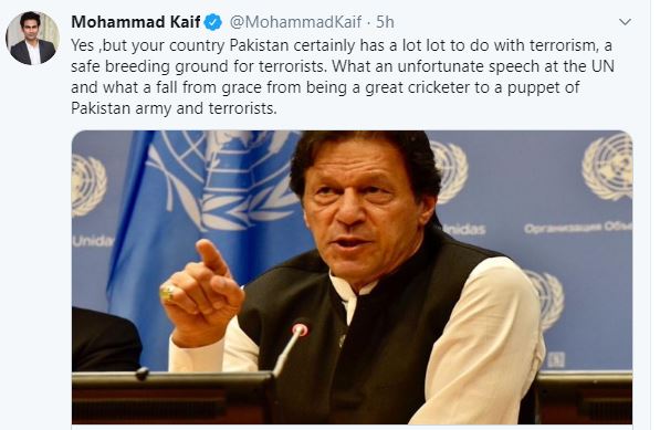 Kaif shared an article of an Indian publication and wrote: "Yes, but your country Pakistan certainly has a lot to do with terrorism, a safe breeding ground for terrorists. What an unfortunate speech at the UN and what a fall from grace from being a great cricketer to a puppet of Pakistan army and terrorists."