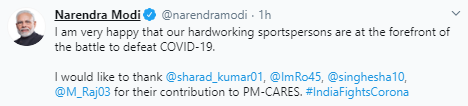 "I am very happy that our hardworking sportspersons are at the forefront of the battle to defeat COVID-19. I would like to thank @sharad_kumar01, @ImRo45, @singhesha10, @M_Raj03 for their contribution to PM-CARES.#IndiaFightsCorona," PM Modi tweeted.