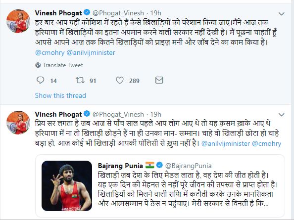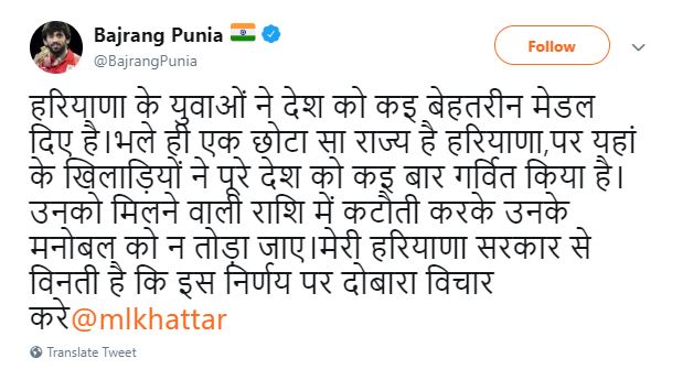 The minister's reaction came after wrestler Bajrang Punia, who hails from Haryana, tweeted against the sports policy of the state government.