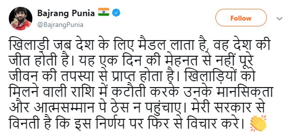 Punia, the Asian Games 2018 gold medalist, criticised the government's decision to curtail the winning amount of the sportsperson, adding that it needs to be re-evaluated.