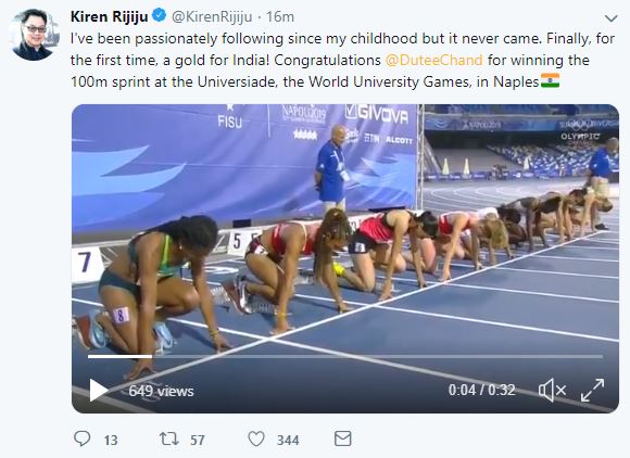 "I've been passionately following since my childhood but it never came. Finally, for the first time, a gold for India! Congratulations @DuteeChand for winning the 100m sprint at the Universiade, the World University Games, in Naples," Rijiju tweeted.