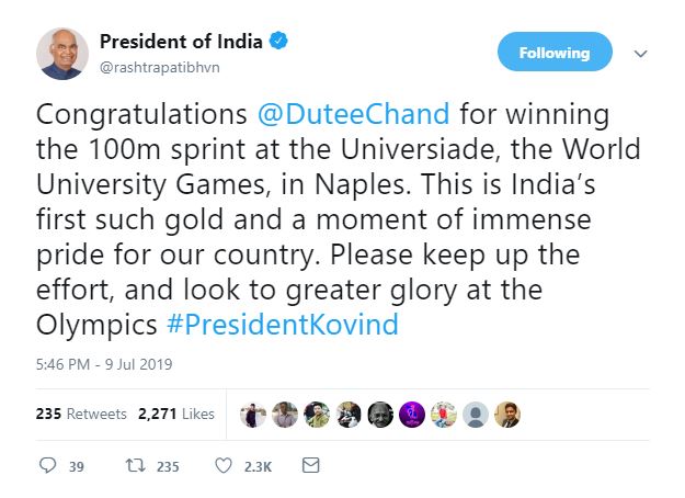 "Congratulations @DuteeChand for winning the 100m sprint at the Universiade, the World University Games, in Naples. This is India's first such gold and a moment of immense pride for our country. Please keep up the effort, and look to greater glory at the Olympics #PresidentKovind," read a tweet on the President's official Twitter handle.