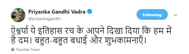 Priyanka Gandhi hails Aishwarya Pissay for claiming FIM World Cup title